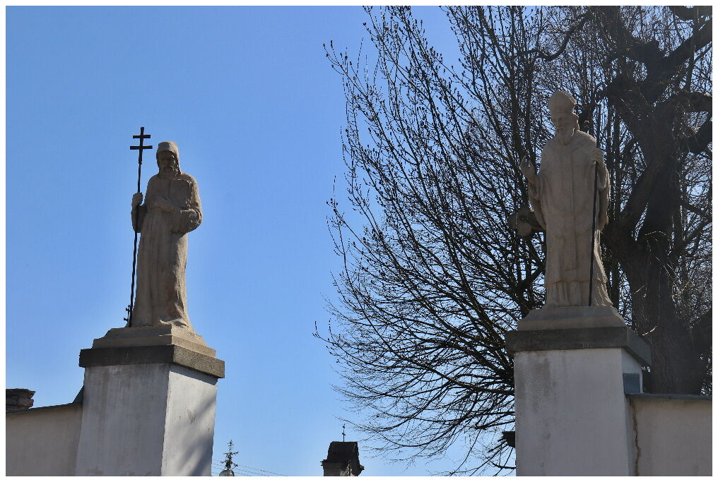 VSTUPNÍ BRÁNA JE OZDOBENA SOCHAMI SV. CYRILA A METODĚJE