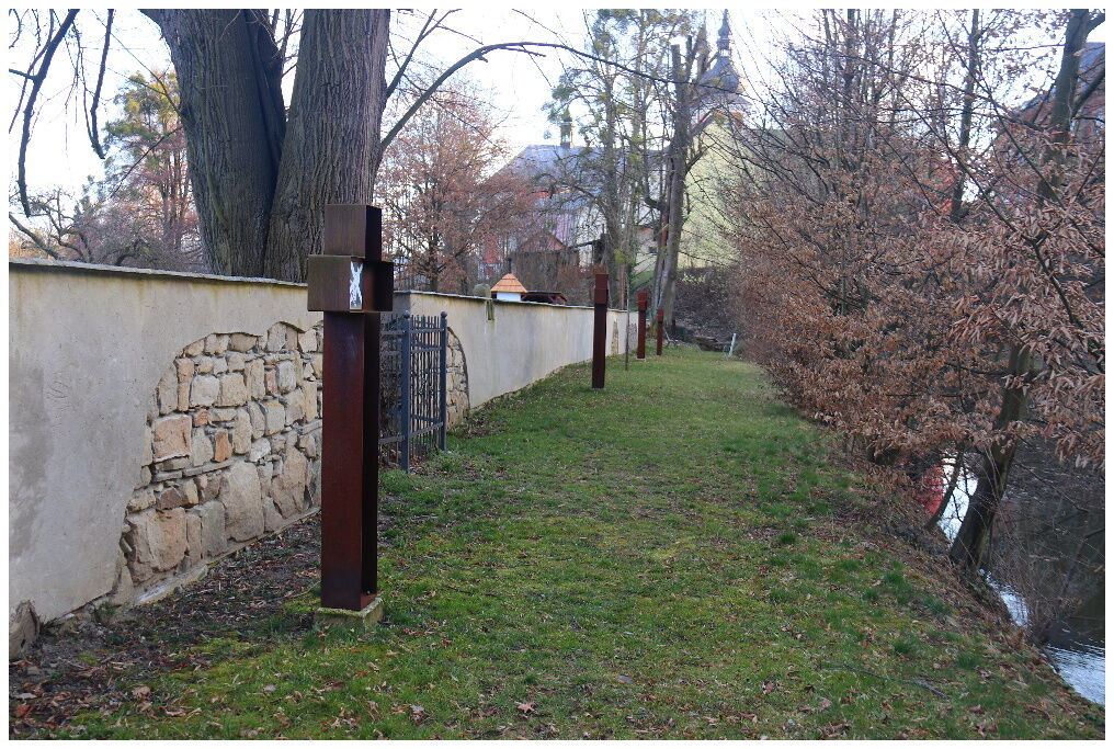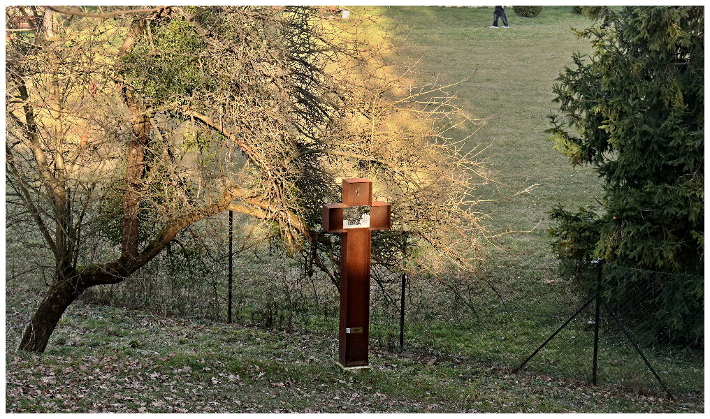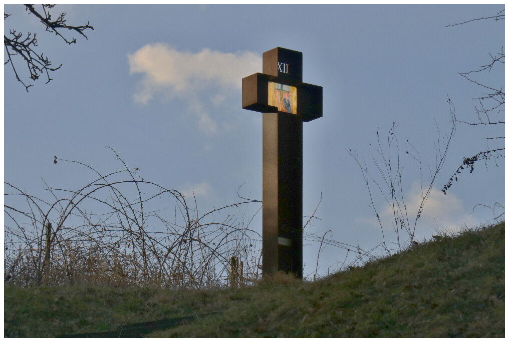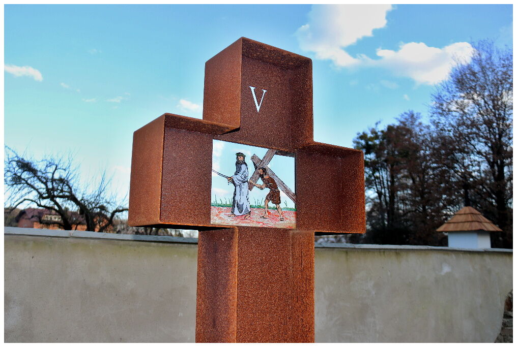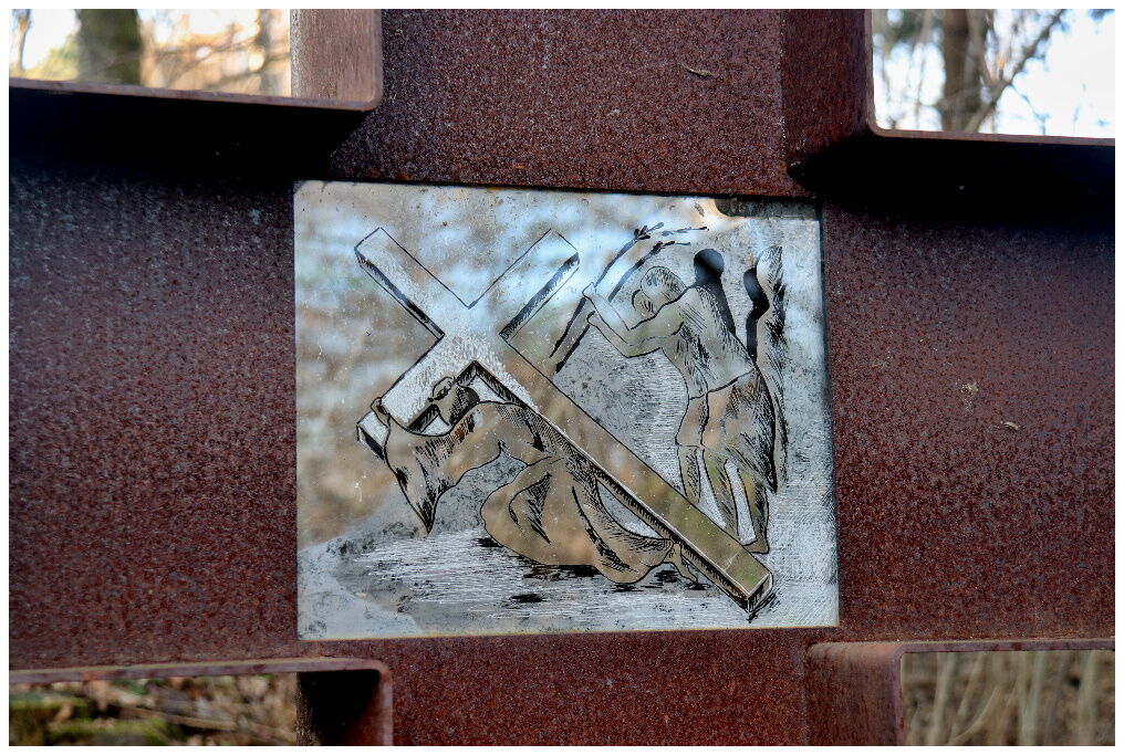 ZASTAVENÍ KŘÍŽOVÉ CESTY TVOŘÍ KŘÍŽE Z CORTENOVÉ OCELI A OBRÁZKY NA SKLE